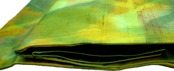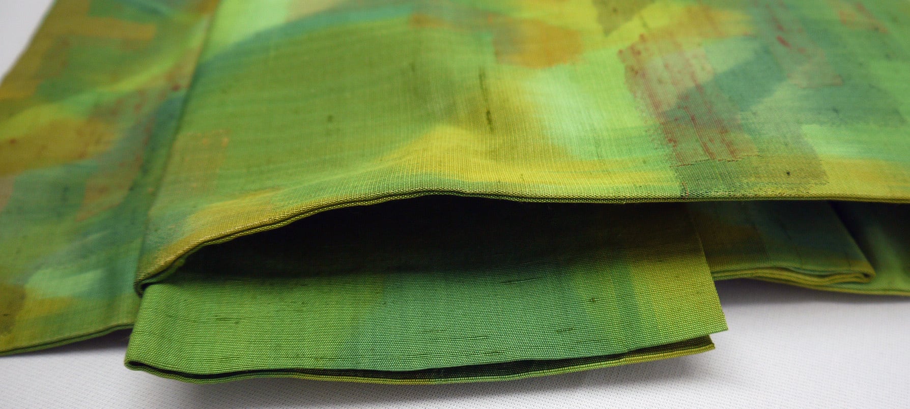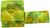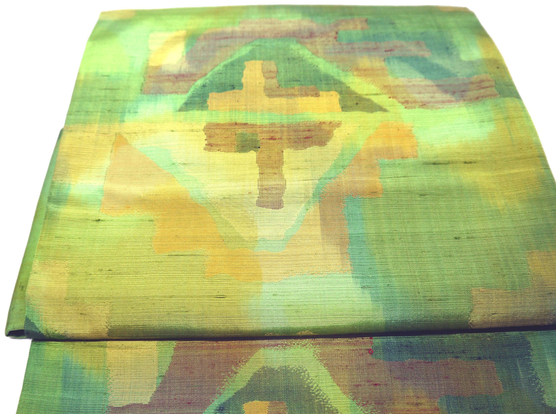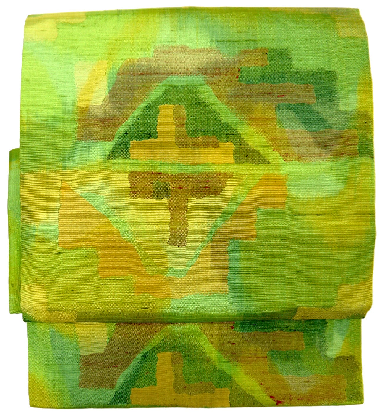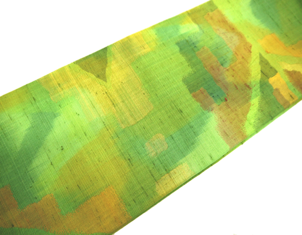 お太鼓部分 幅30.5cm×長さ37.5cm 胴部分 幅16cm×長さ189cm 手織り紬抽象模様 黄緑 正絹 Silk 状態は写真でご確認ください
