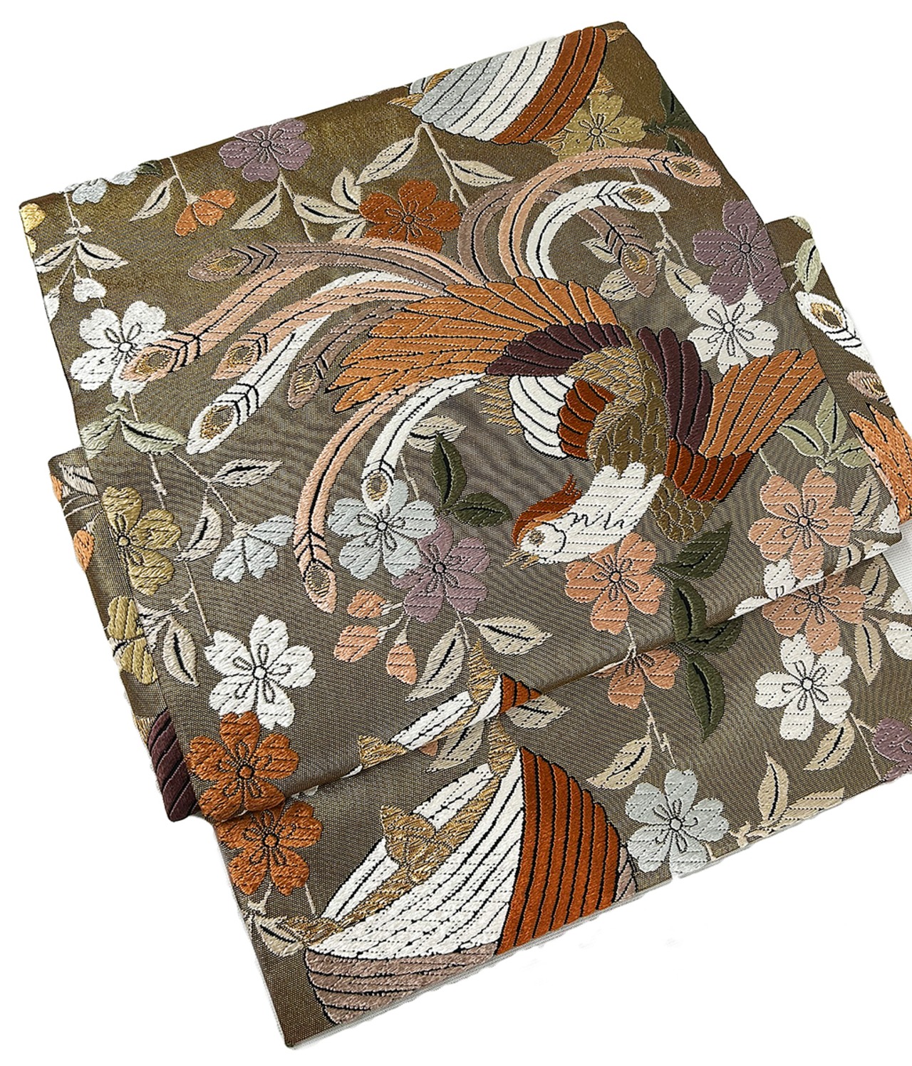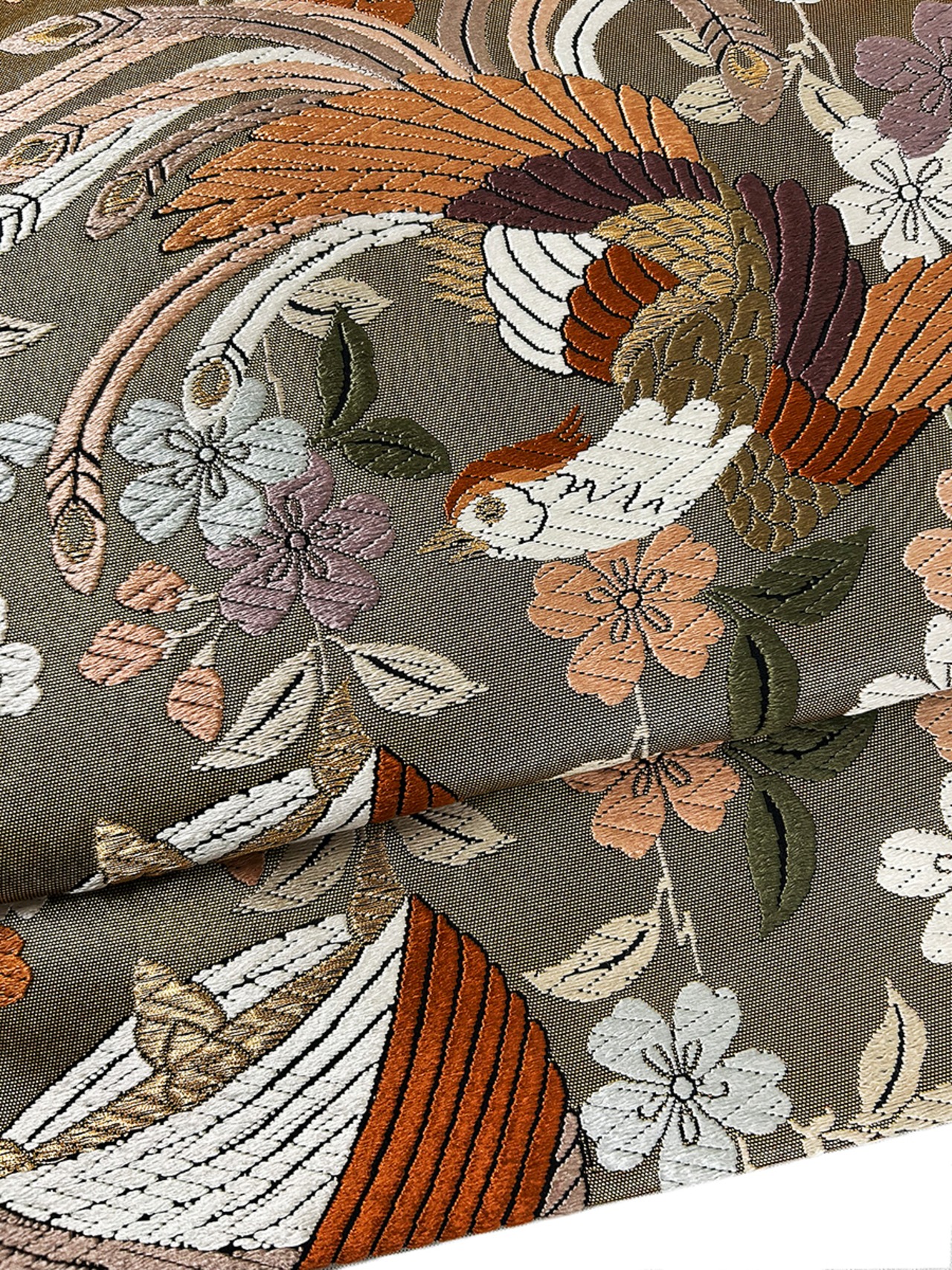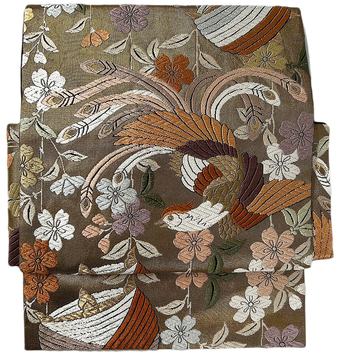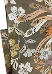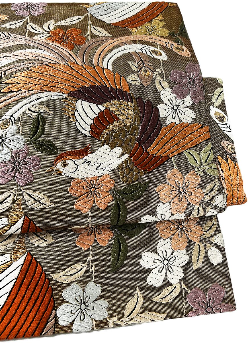 この美しい作り帯は、着付けを習った方でも簡単にお召しいただけるアイテムです!華やかな尾長鳥と繊細な糸巻柄が印象的で、特別な日や普段使いでもぴったりです。