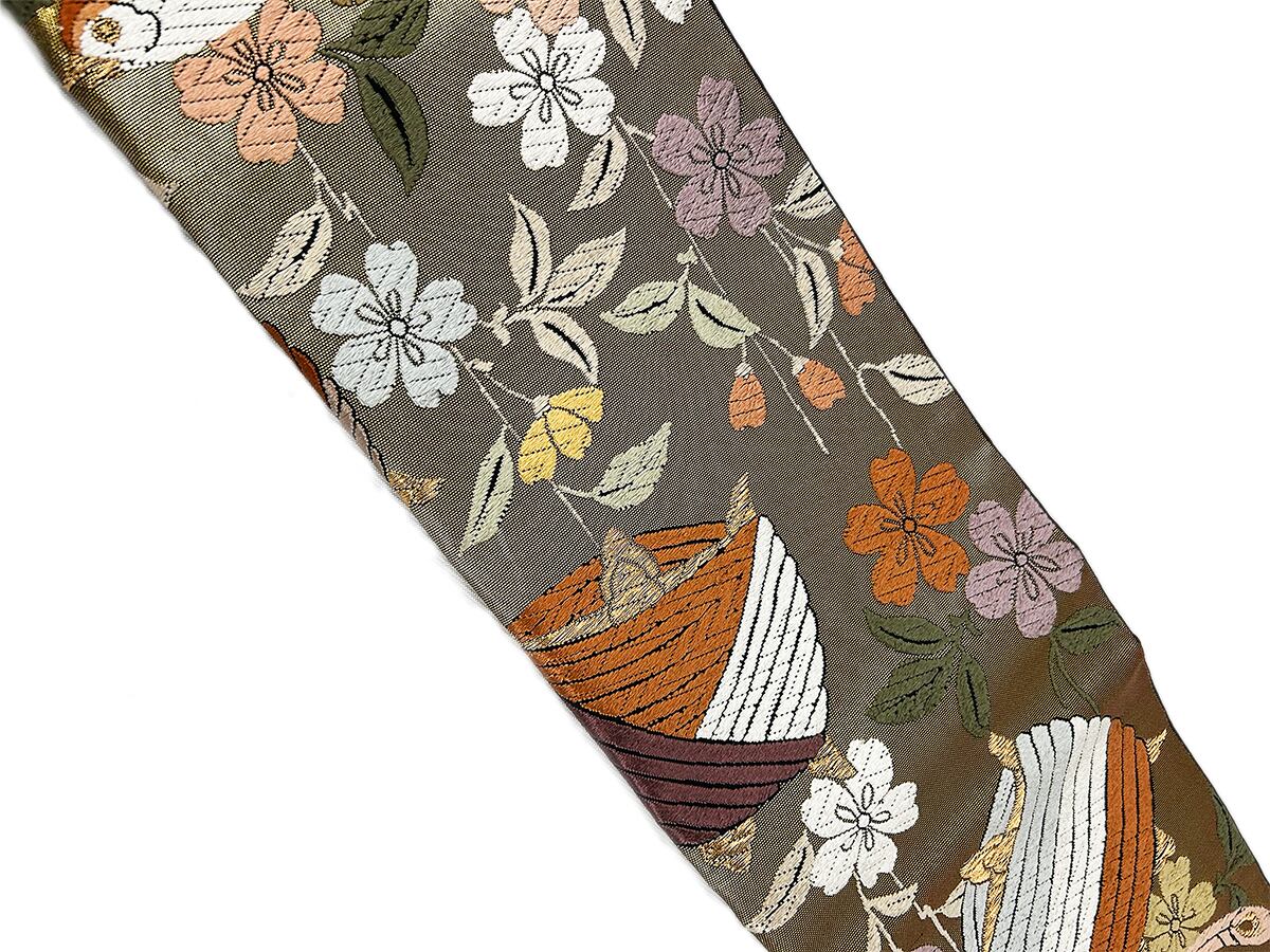 正絹の素材に金銀糸が施されており、高級感がありつつも日常使いしやすいお洒落なデザインです。光の当たり方によって変わるきらめきも、この帯の魅力の一つです。