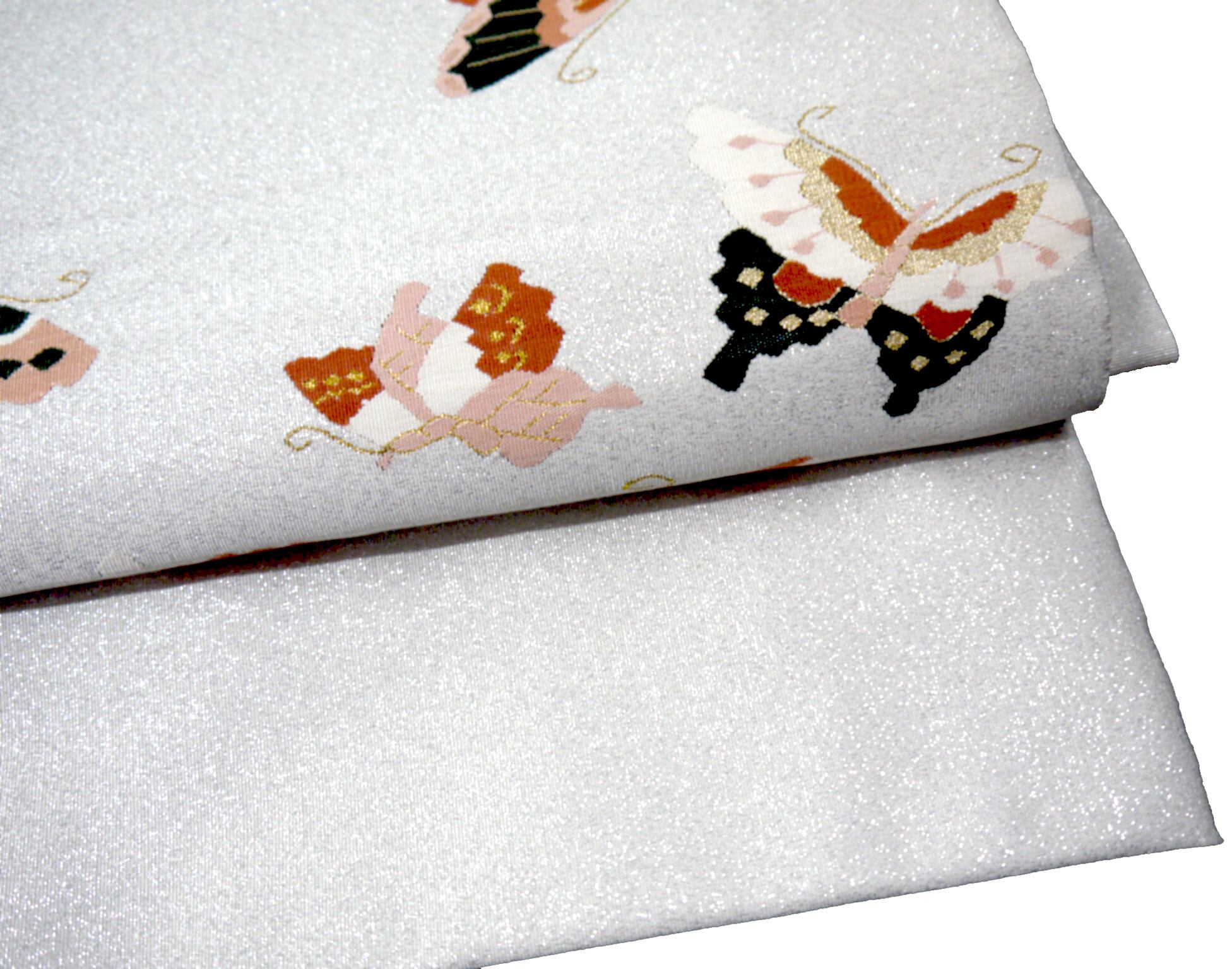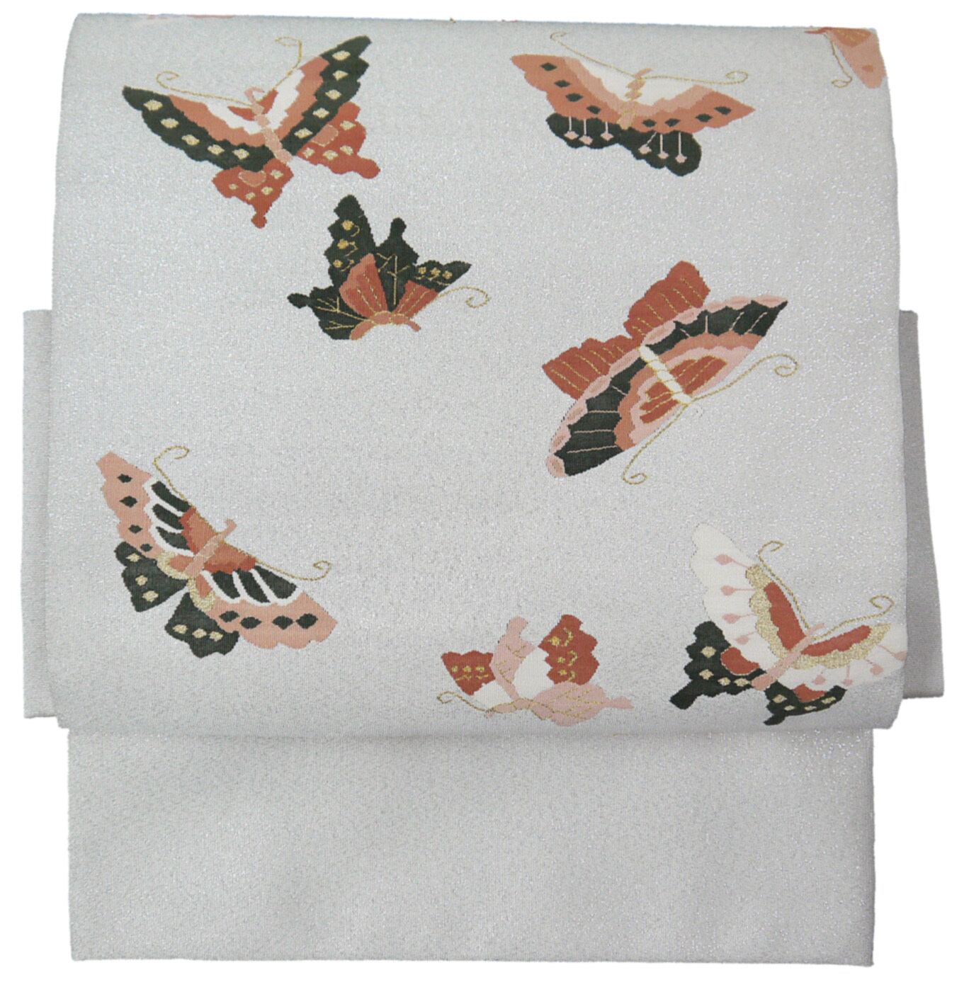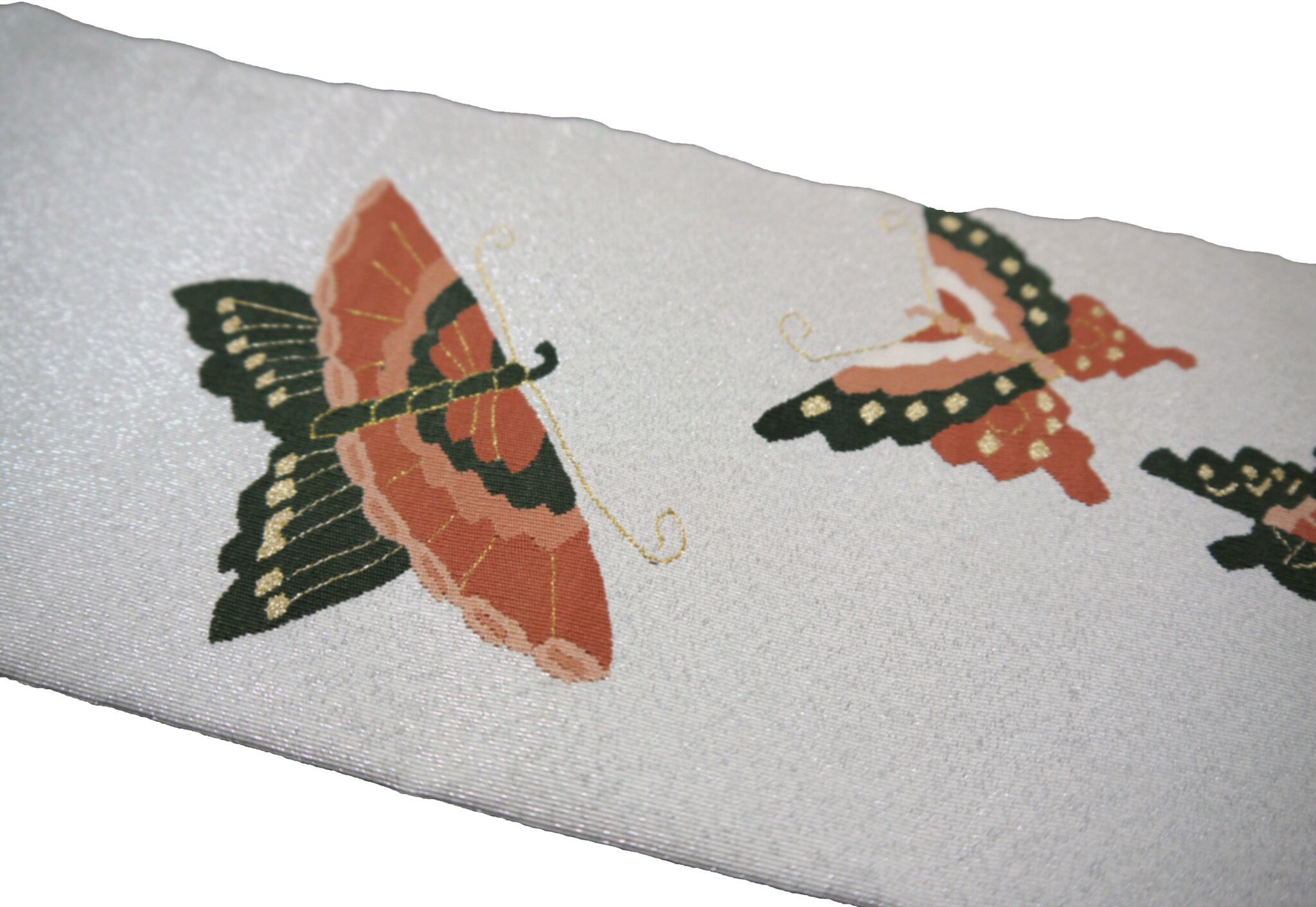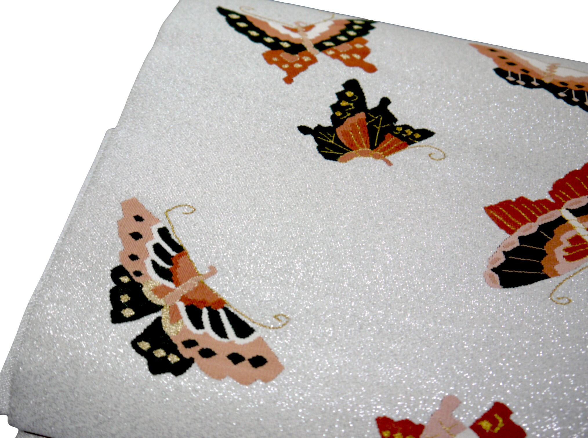 本綴れ銀通し蝶模様でお太鼓部分 幅31.5cm×長さ39cm 胴部分 幅17cm×長さ188cm SIlk 状態は大変良いです.。ほぼ未使用のリユースの帯を作り帯に仕立てました。