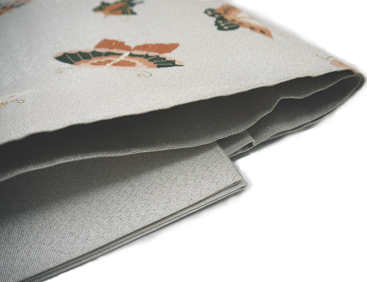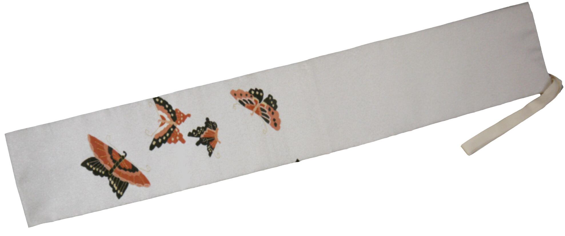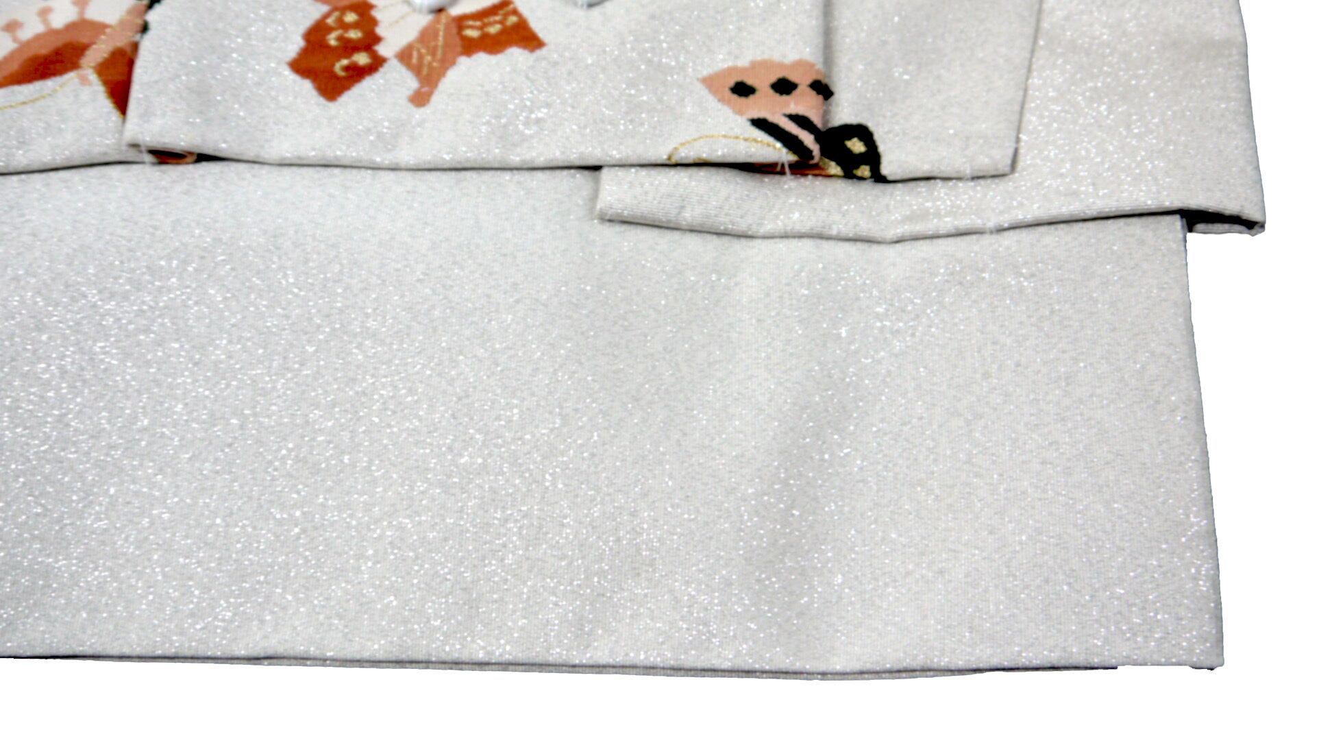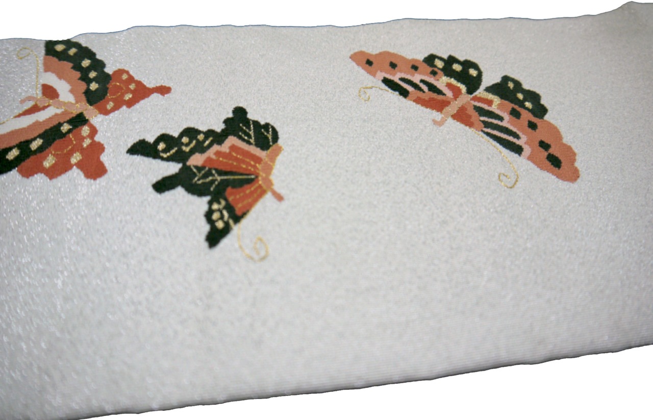 本綴れ銀通し蝶模様でお太鼓部分 幅31.5cm×長さ39cm 胴部分 幅17cm×長さ188cm SIlk 状態は大変良いです.。ほぼ未使用のリユースの帯を作り帯に仕立てました。