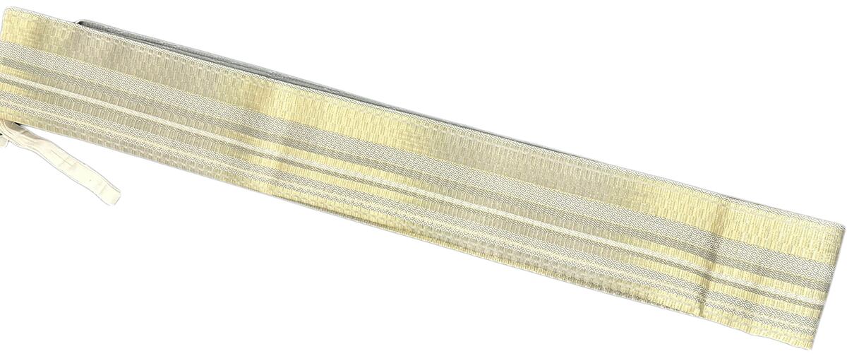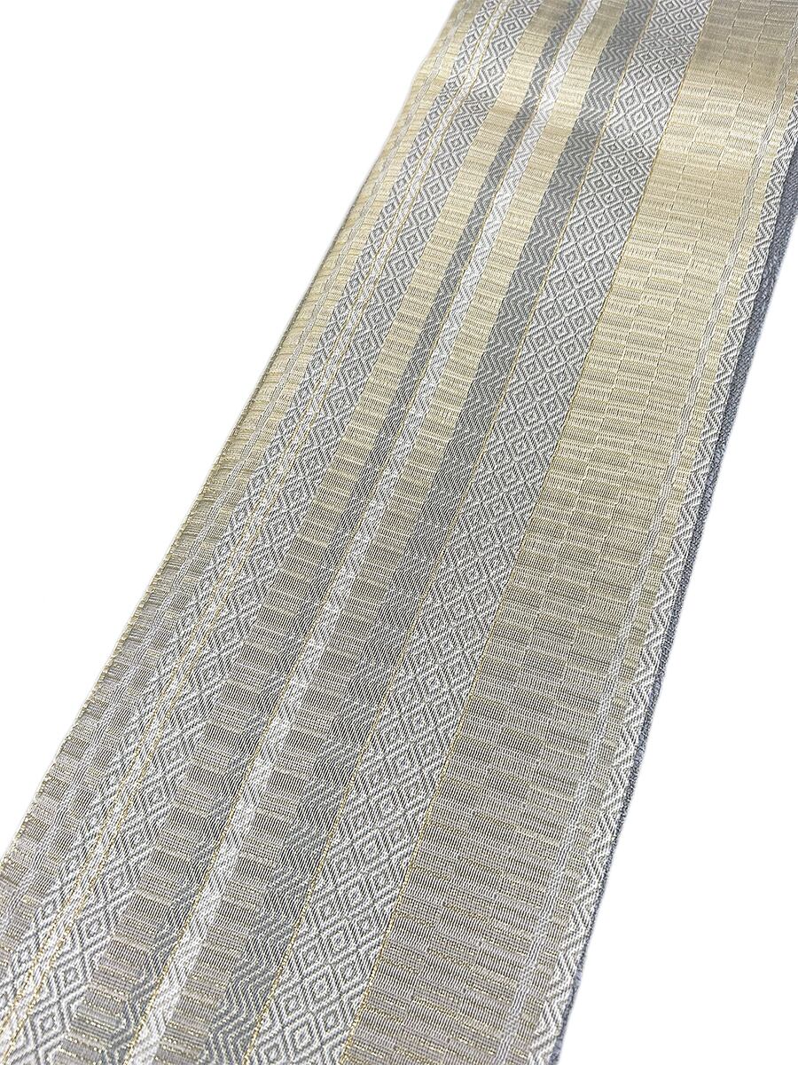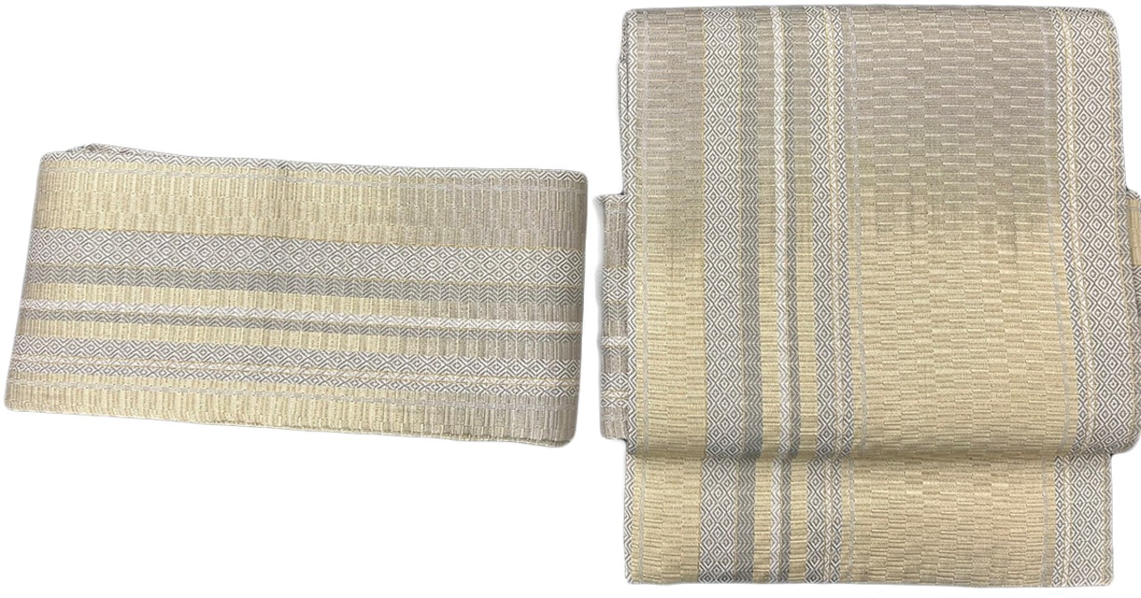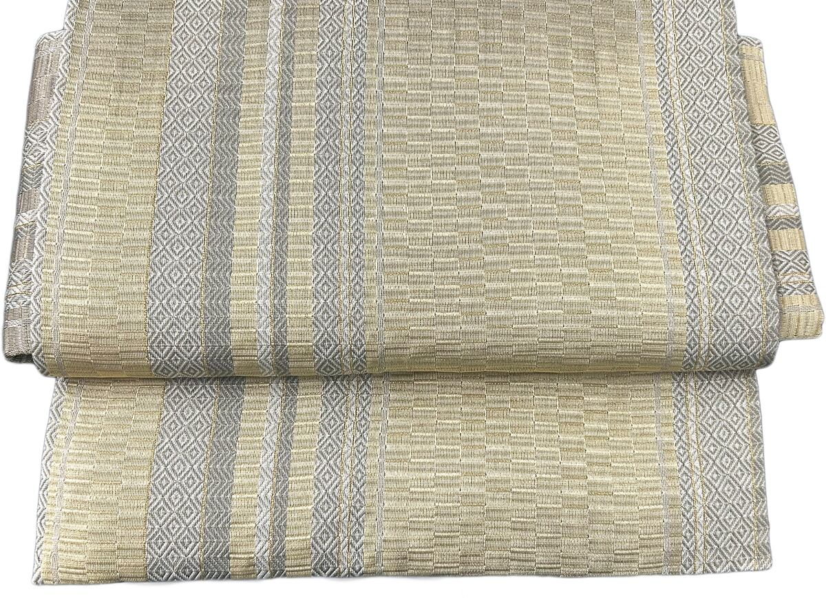 幾何学 菱 金糸 よもぎ色 お太鼓部分 幅30.5cm×長さ38cm 胴部分 幅16cm×長さ184cm SIlk 状態は大変良いです.。ほぼ未使用のリユースの帯を作り帯に仕立てました。