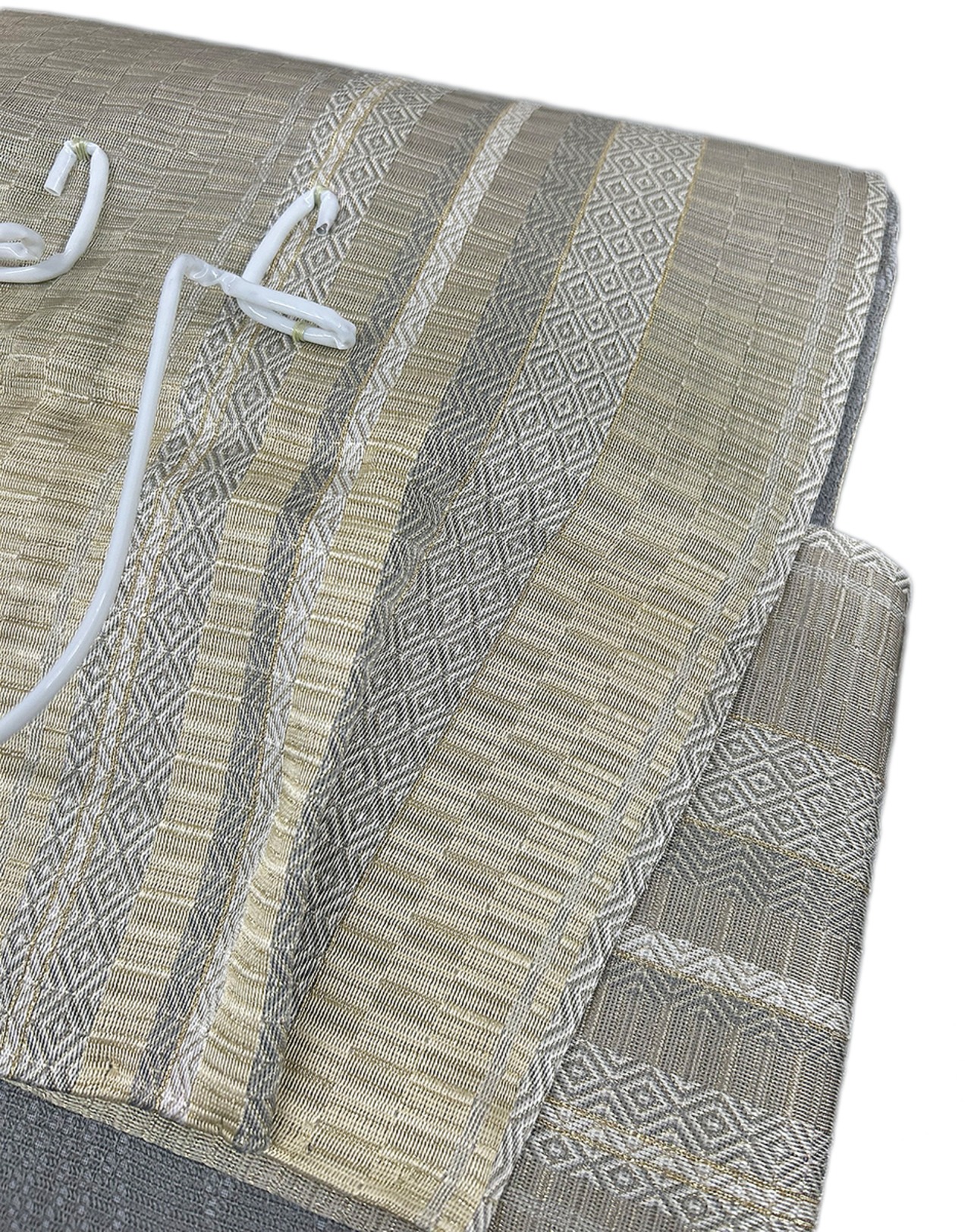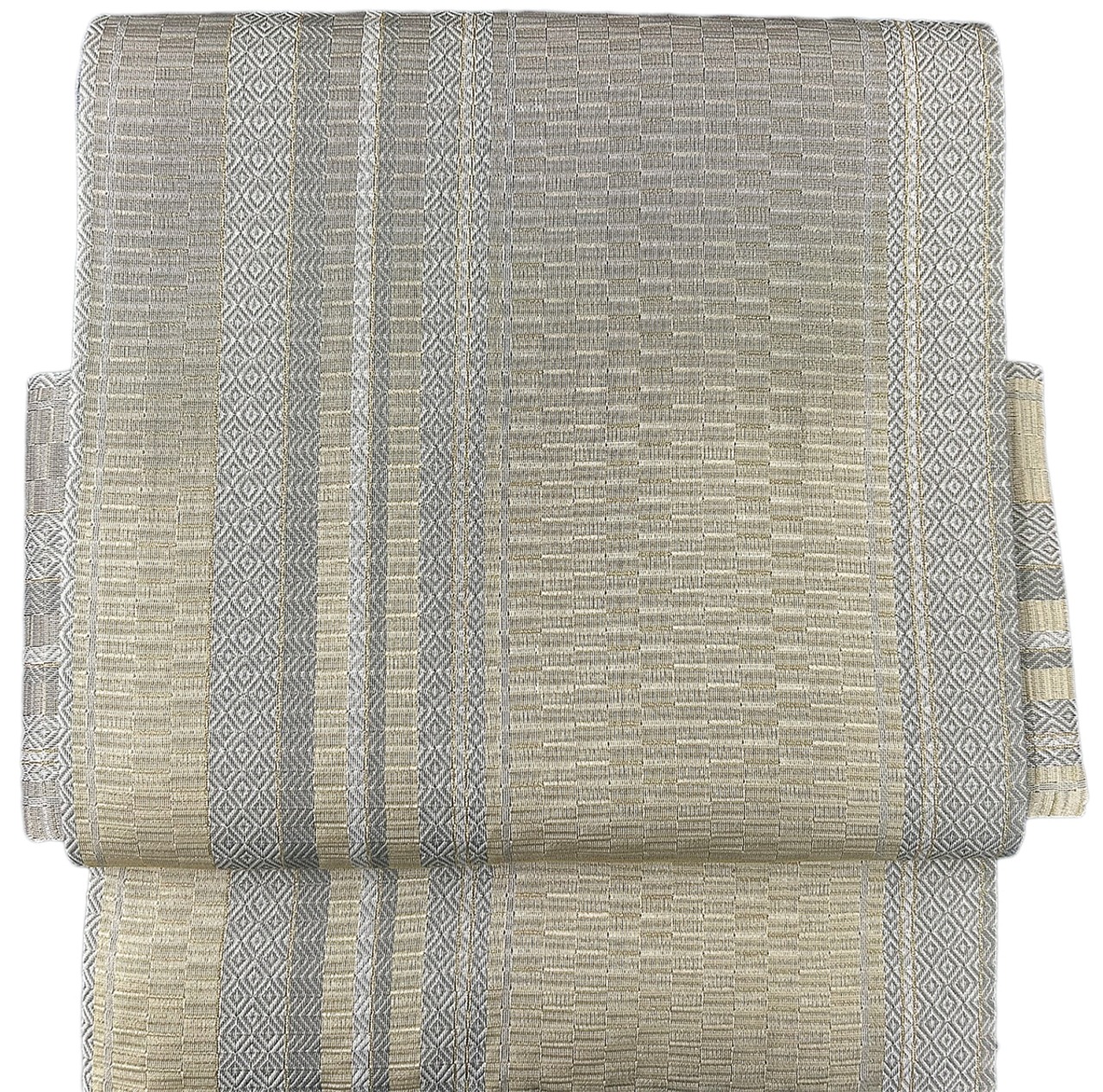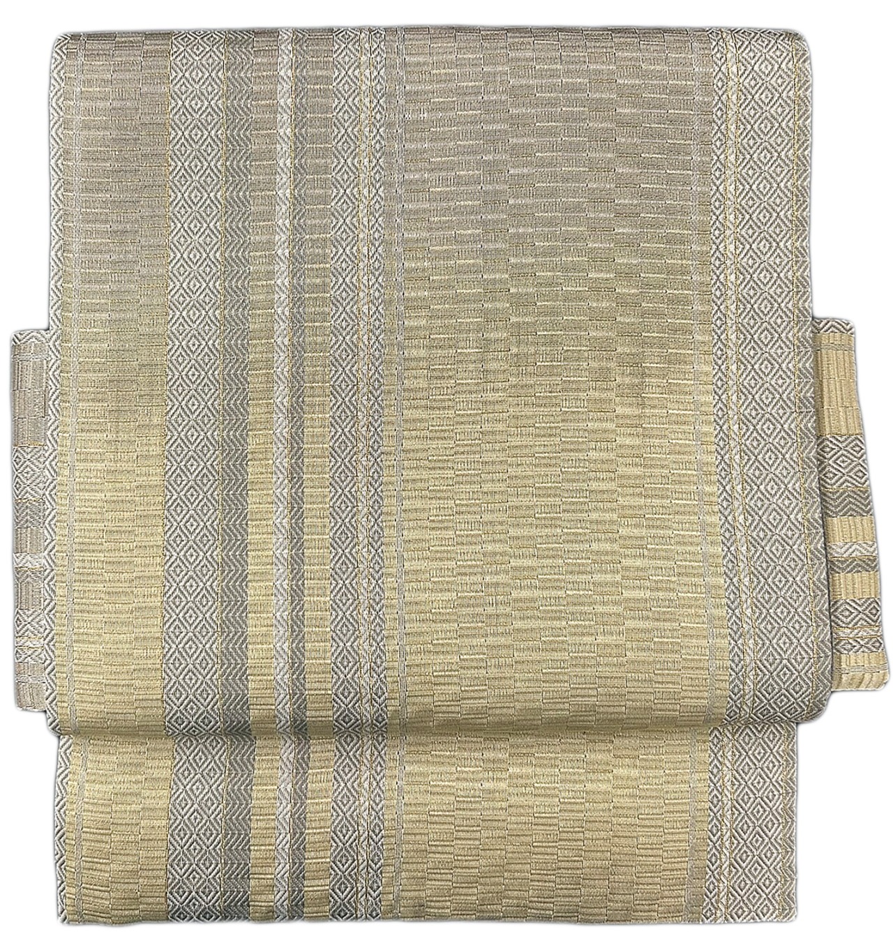幾何学 菱 金糸 よもぎ色 お太鼓部分 幅30.5cm×長さ38cm 胴部分 幅16cm×長さ184cm SIlk 状態は大変良いです.。ほぼ未使用のリユースの帯を作り帯に仕立てました。