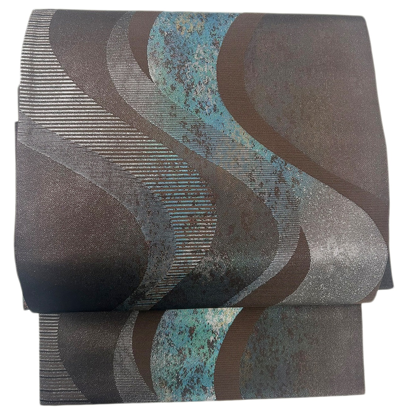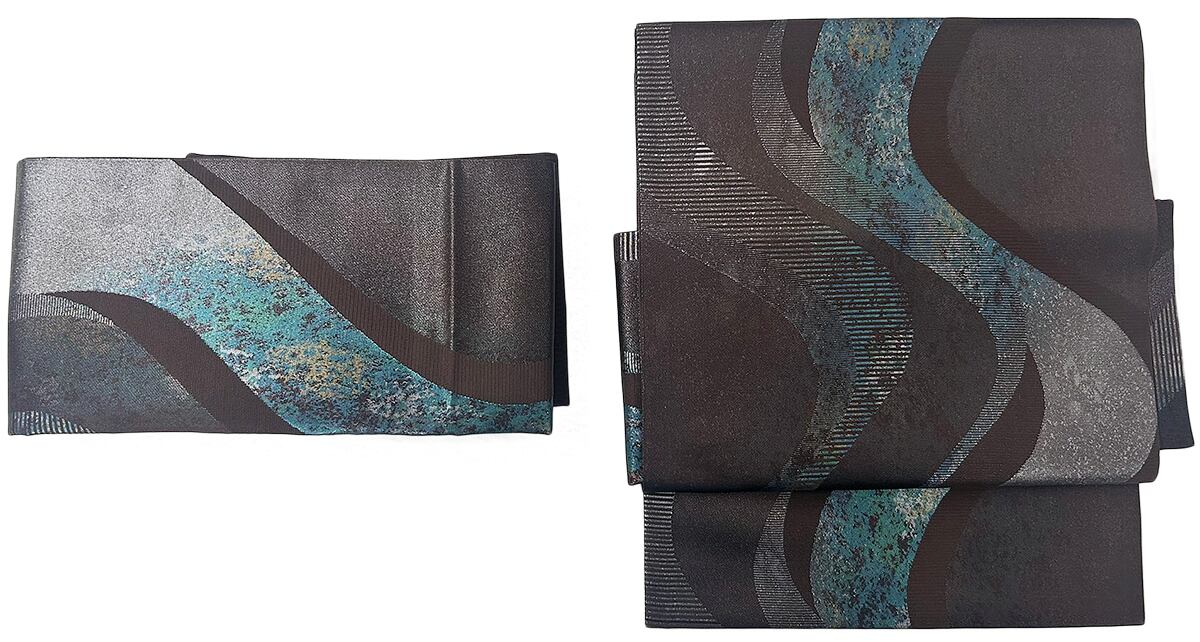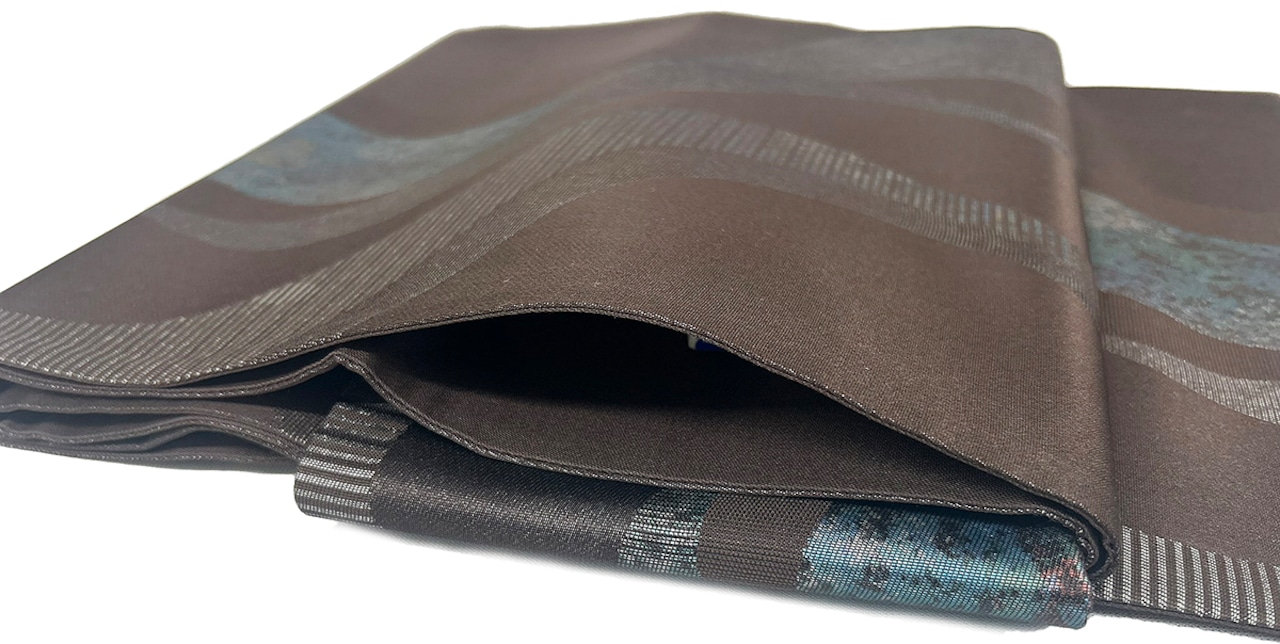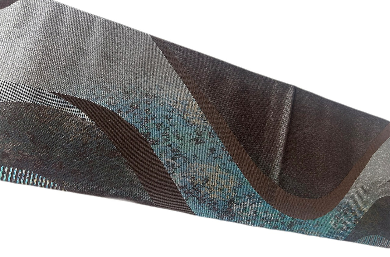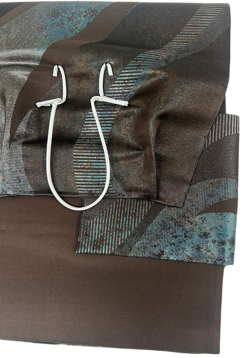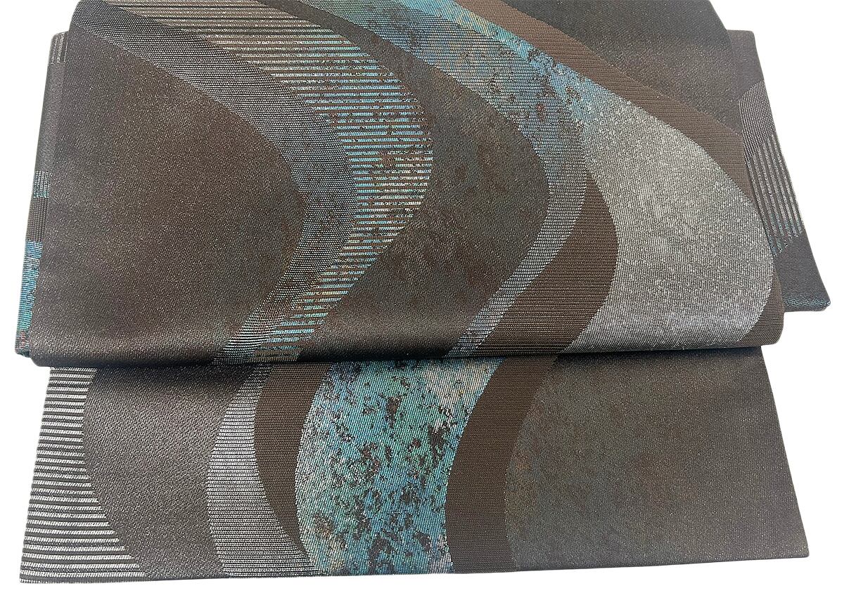 よろけ縞 箔 焦茶色 お太鼓部分 幅30.5cm×長さ38cm 胴部分 幅16cm×長さ184cm SIlk 状態は大変良いです.。リユースの帯を作り帯に仕立てました。
