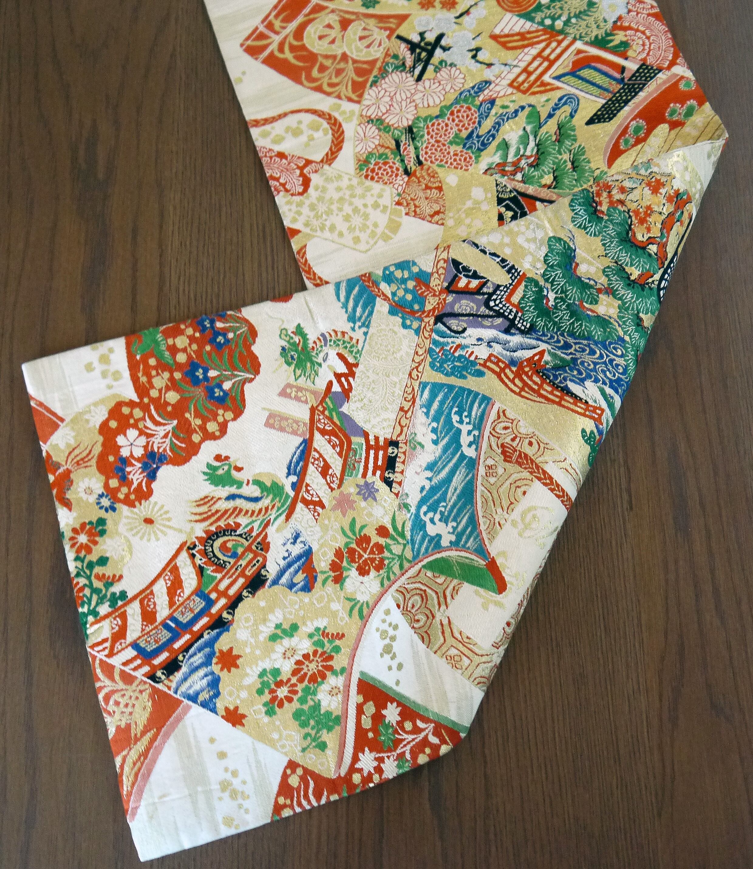桜楓 アンティーク帯 テーブルランナー テーブルセンター 読本に宝船・草花模様 M0052